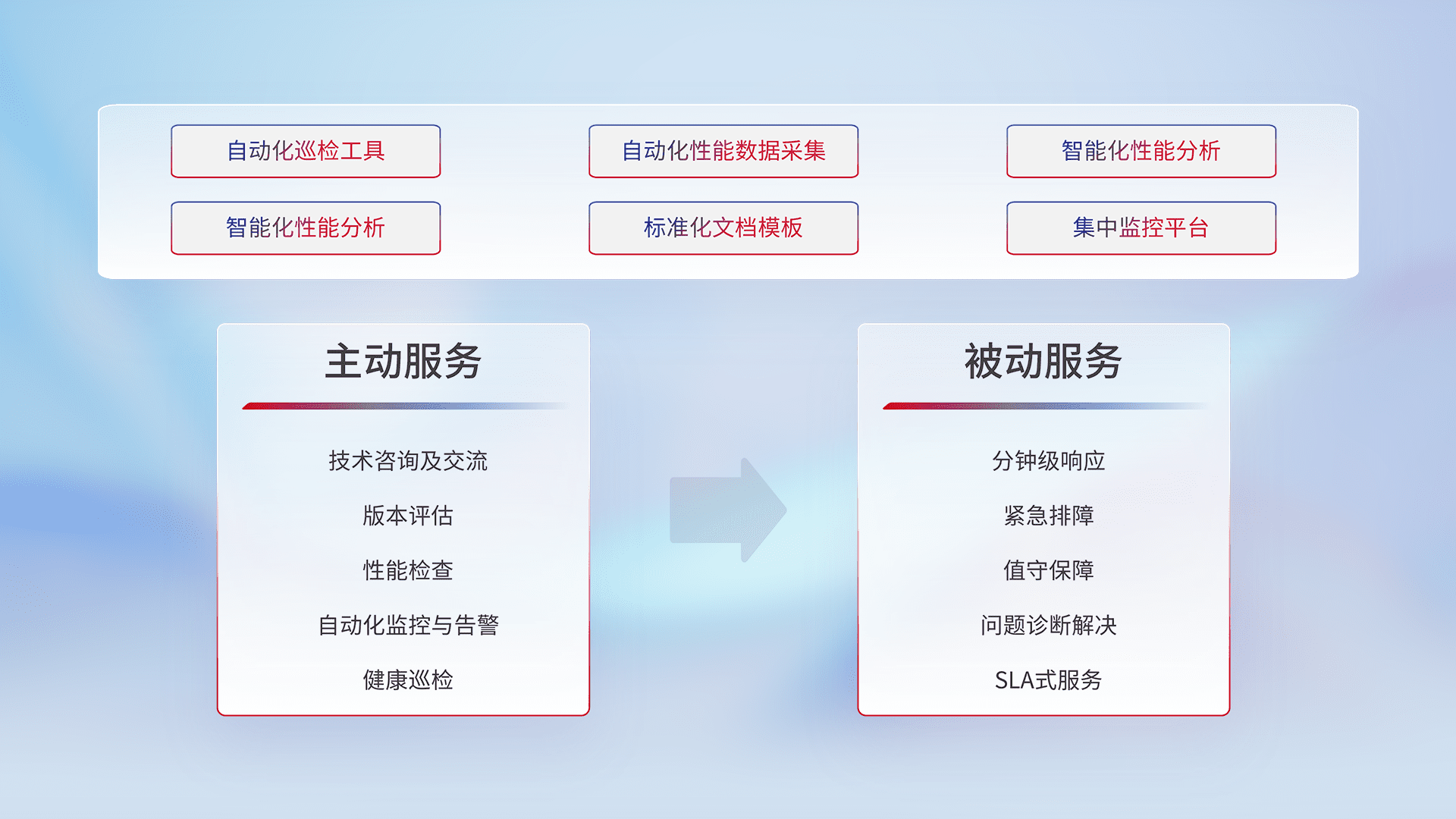智能化工具和标准化文档,,,保障服务质量,,提供主动服务(包含技术咨询、、版本评估、、、性能检查、、自动化监控与告警、、健康巡检)和被动服务包含(分钟级响应、、、、紧急排障、、、、值守保障、、、问题诊断解决、、SLA服务)。。。。