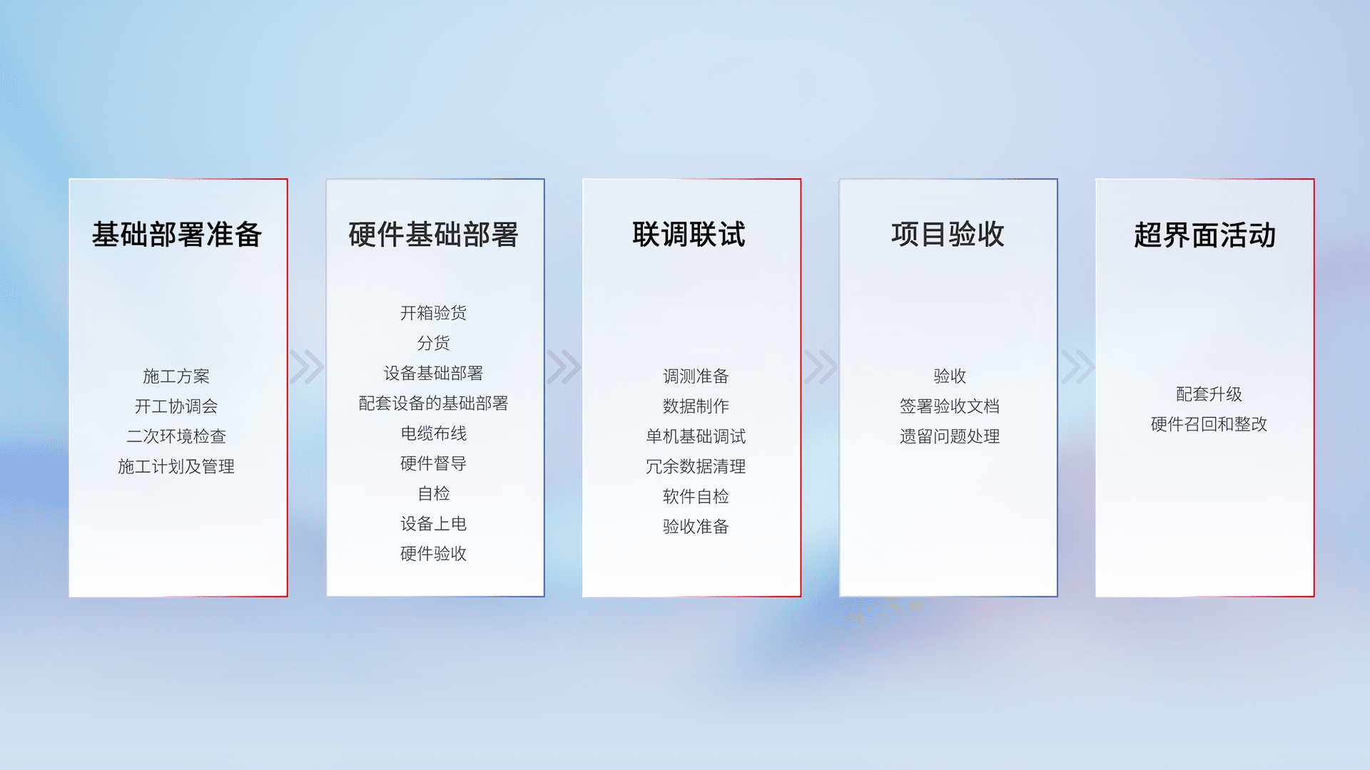 从基础部署准备、、、、硬件基础部署、、联调联试、、、、项目验收、、、越界面活动的全过程可追溯,,,,保证施工质量和进度。。。